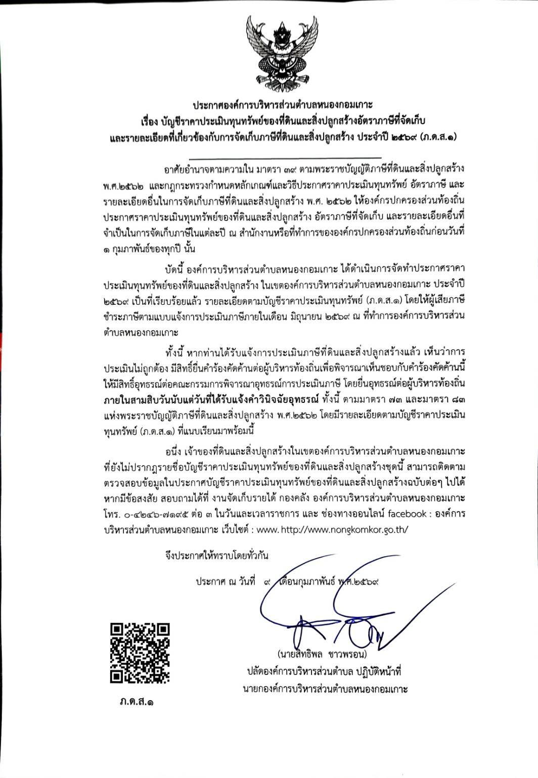 บัญชีราคาประเมินทุนทรัพย์ของที่ดินและสิ่งปลูกสร้างอัตราภาษีที่จัดเก็บและรายละเอียดที่เกี่ยวข้องกับการจัดเก็บภาษีที่ดินและสิ่งปลูกสร้าง ประจำปี 2569 (ภ.ด.ส.1)