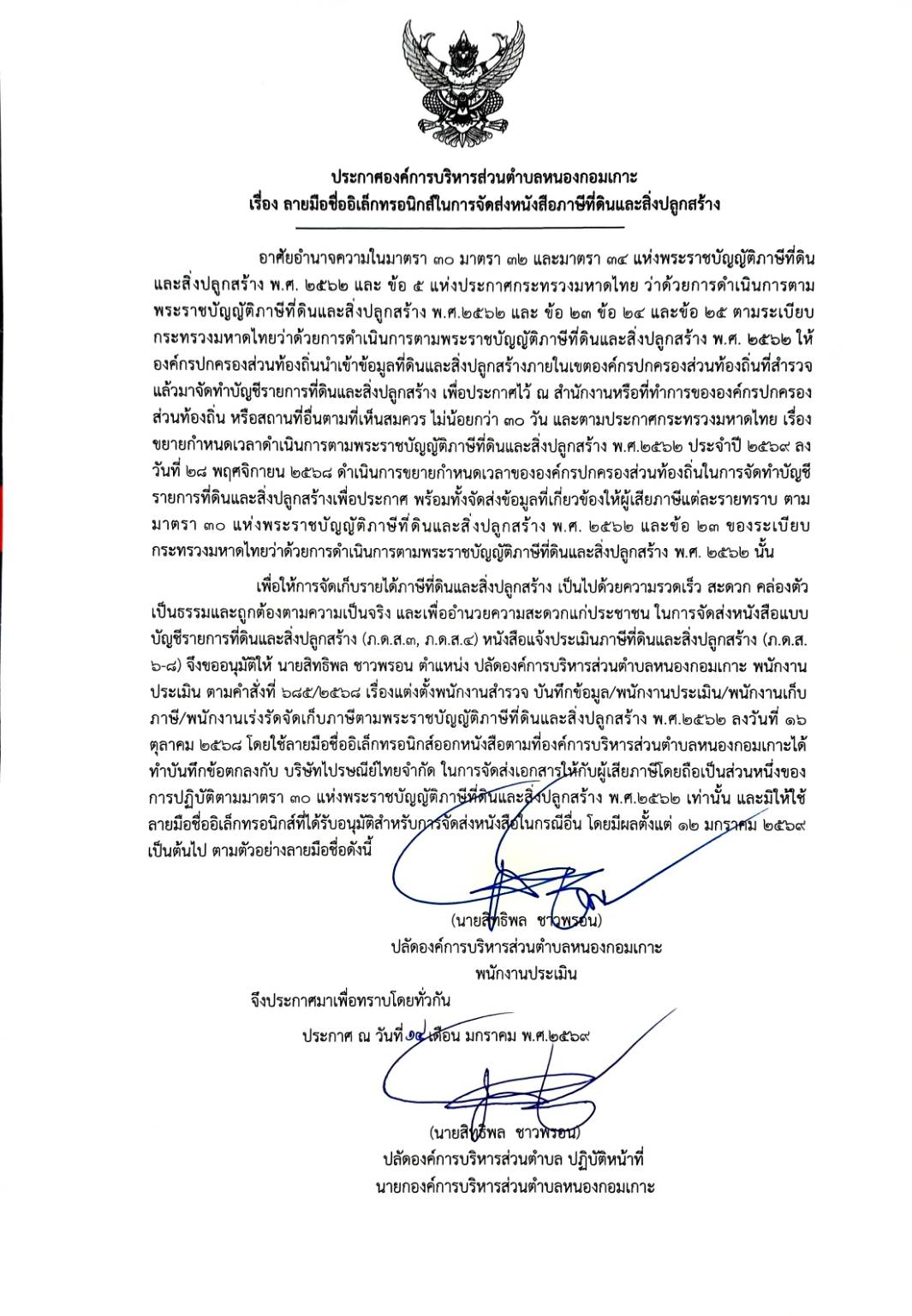 ลายมือชื่ออิเล็กทรอนิกส์ในการจัดส่งหนังสือภาษีที่ดินและสิ่งปลูกสร้าง